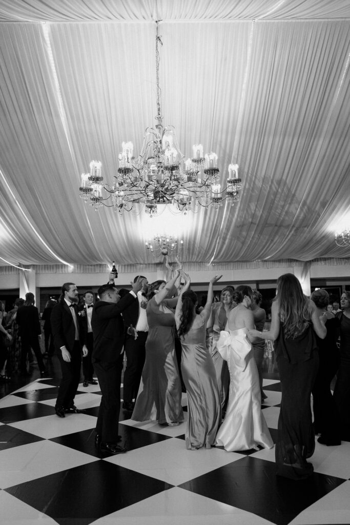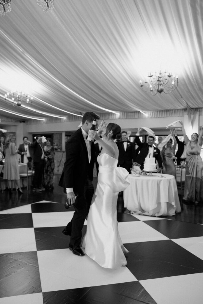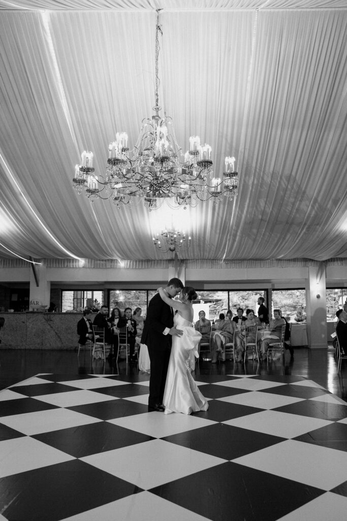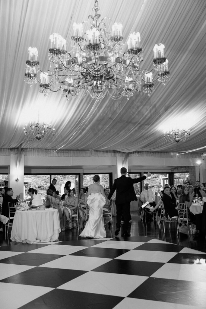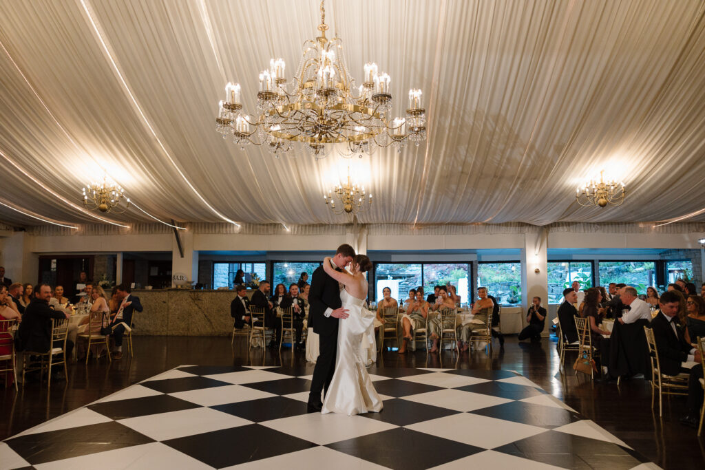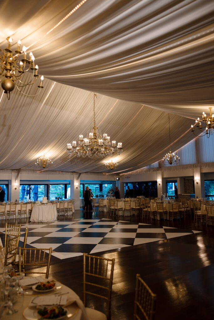 Guests enjoyed an outdoor cocktail hour on the property, savoring the peaceful gardens, string lights, and watching the perfect fall sunset. As evening approached, the reception tent came alive with glowing candlelit tables, sweeping drapery, sparkling chandeliers, and a stunning black-and-white checkerboard dance floor that made the entire room feel editorial and romantic. Every detail felt genuine, elevated, and filled with love and celebration.