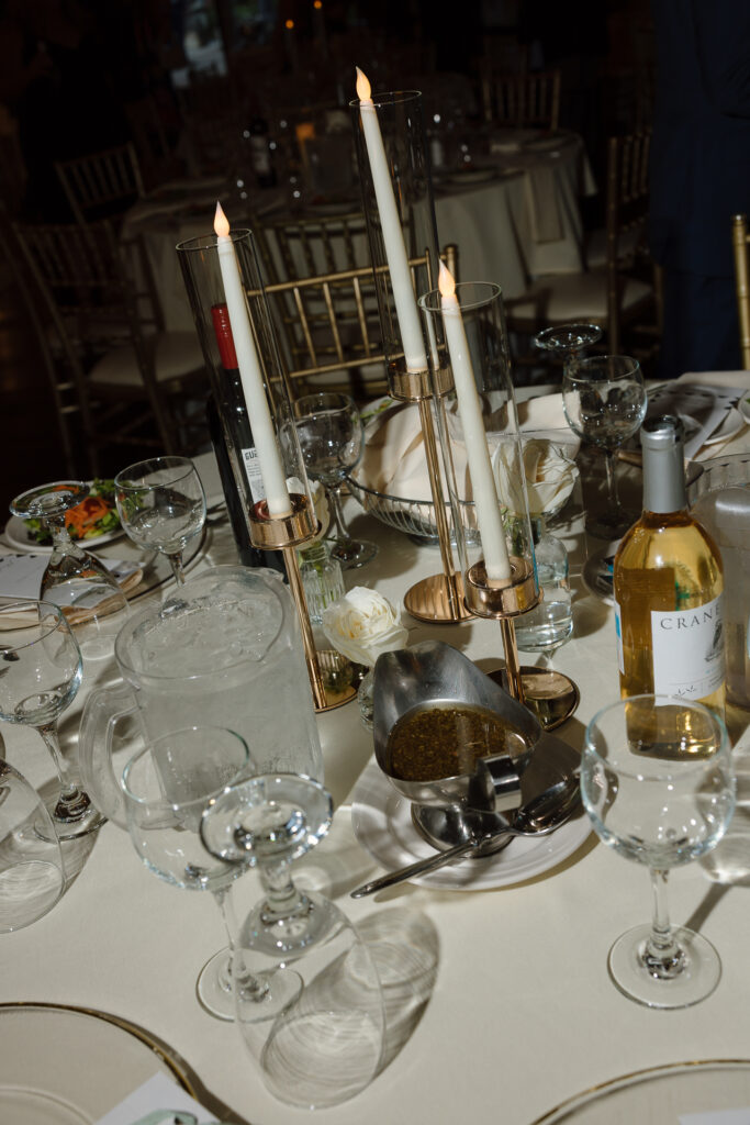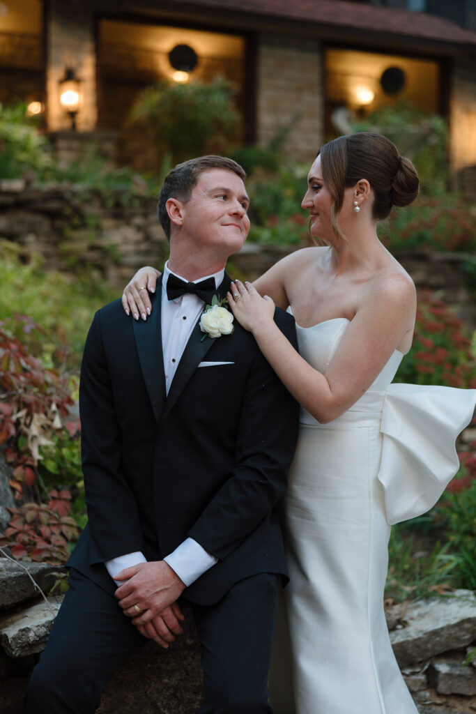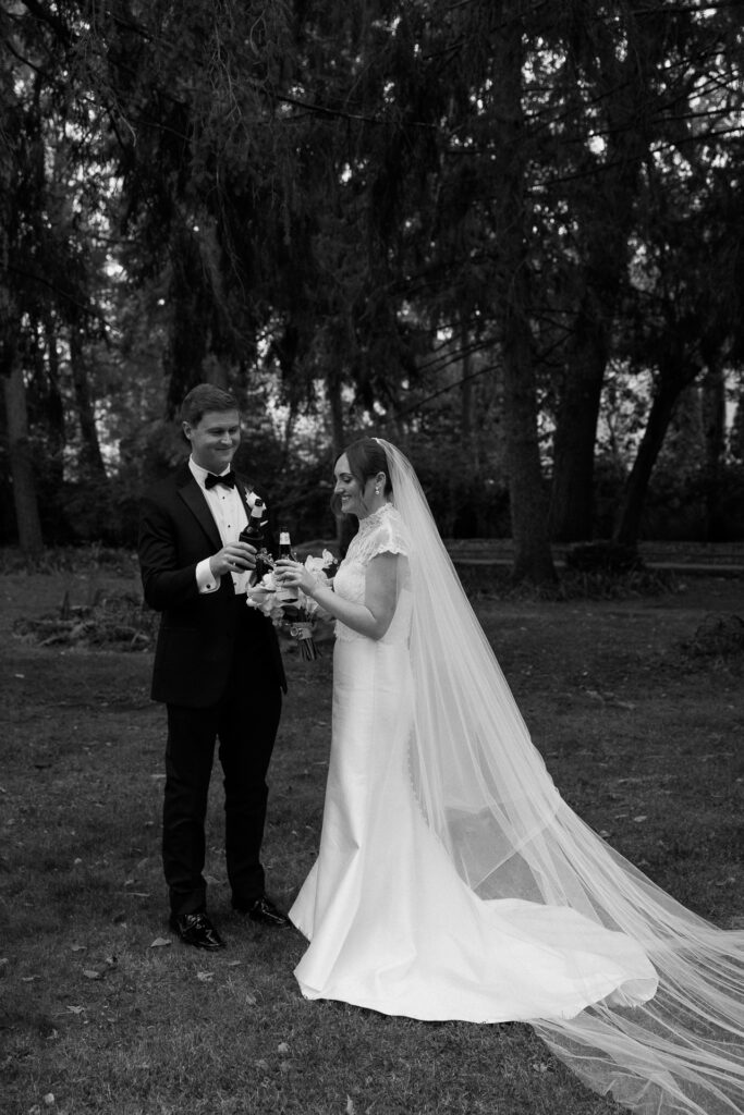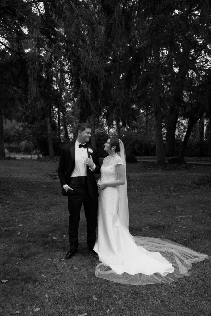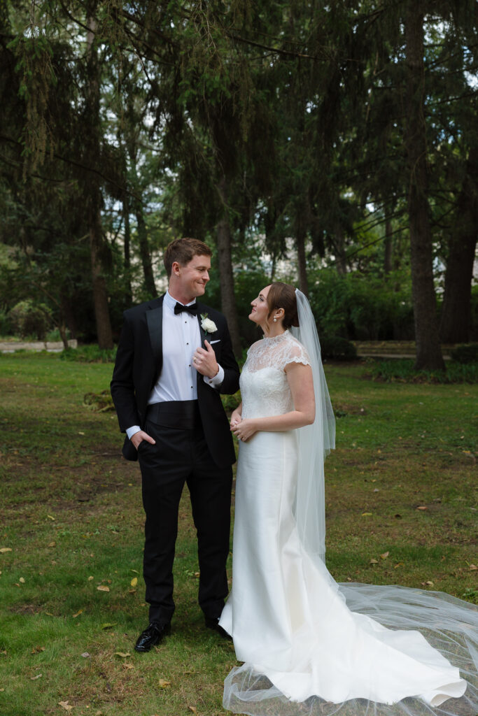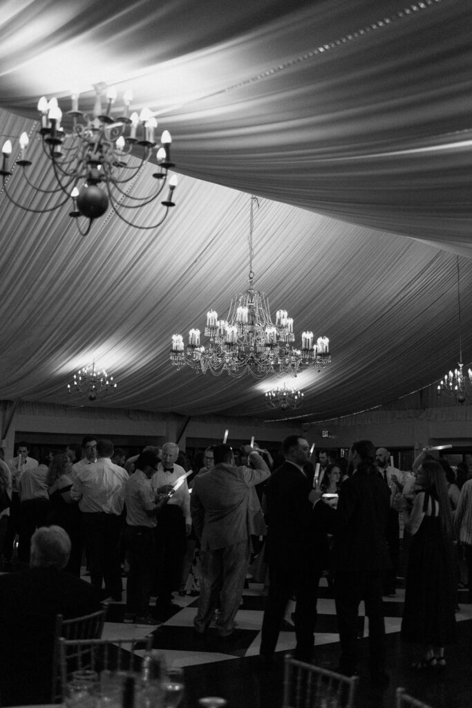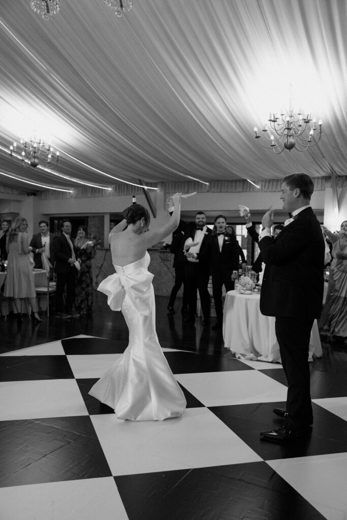 Guests enjoyed an outdoor cocktail hour on the property, savoring the peaceful gardens, string lights, and watching the perfect fall sunset. As evening approached, the reception tent came alive with glowing candlelit tables, sweeping drapery, sparkling chandeliers, and a stunning black-and-white checkerboard dance floor that made the entire room feel editorial and romantic. Every detail felt genuine, elevated, and filled with love and celebration.