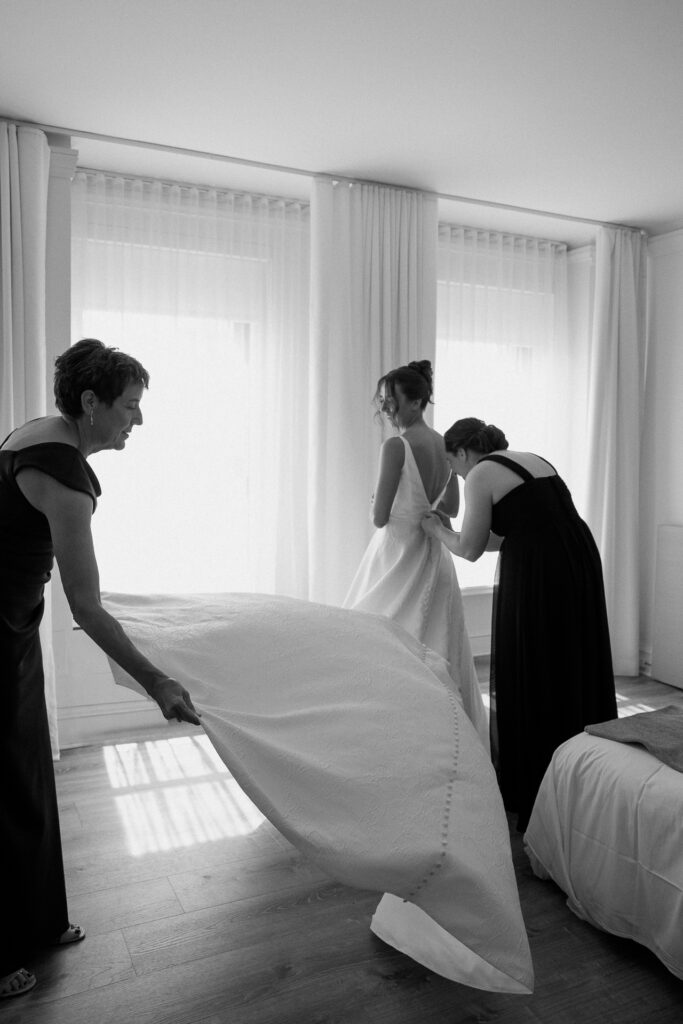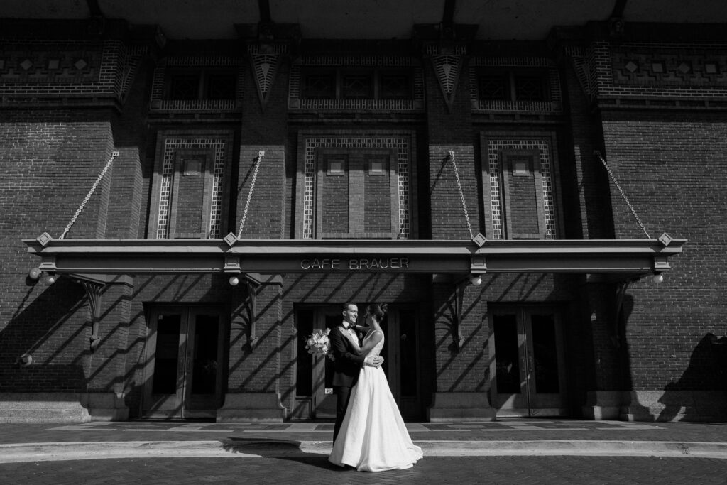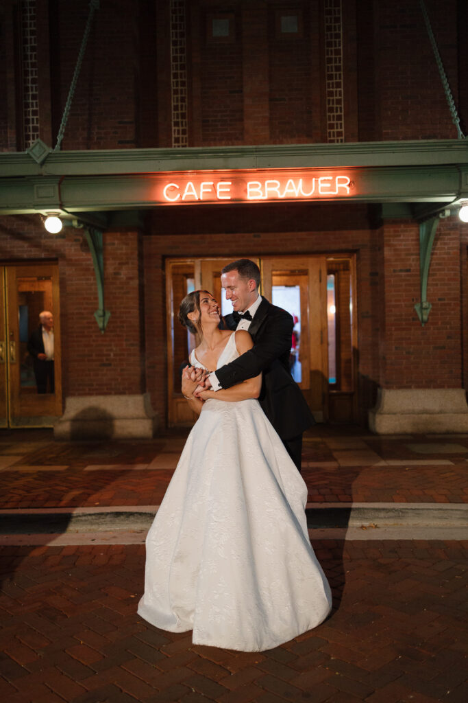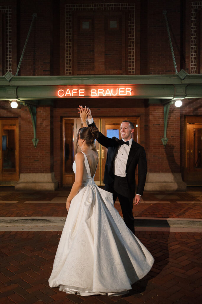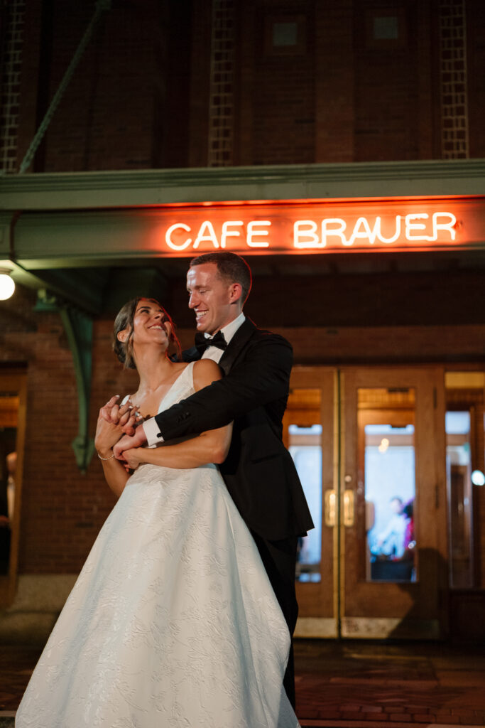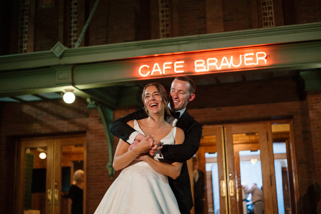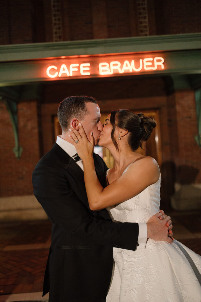 The celebration continued at Café Brauer, a venue deeply rooted in Nicole’s family story. The couple honored that legacy with thoughtful details, incorporating the same emblem her parents used on their wedding day, and Zach meticulously hand-stamped matchboxes as guest favors. Having their closest family and friends gathered around made the day even more special.